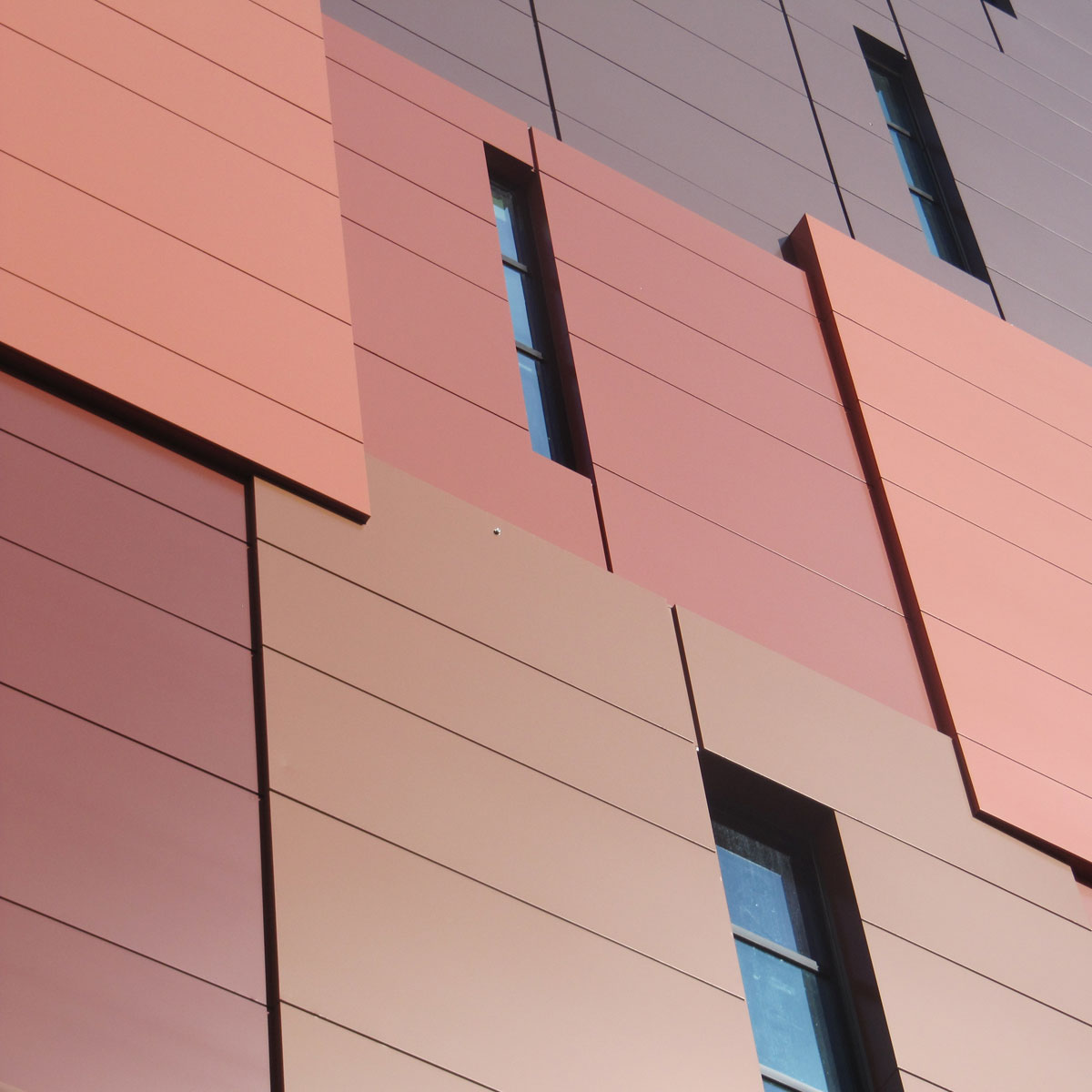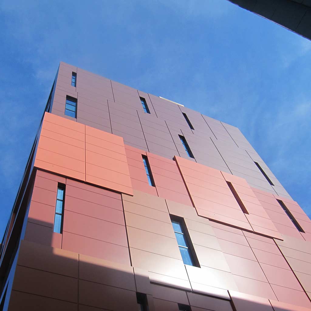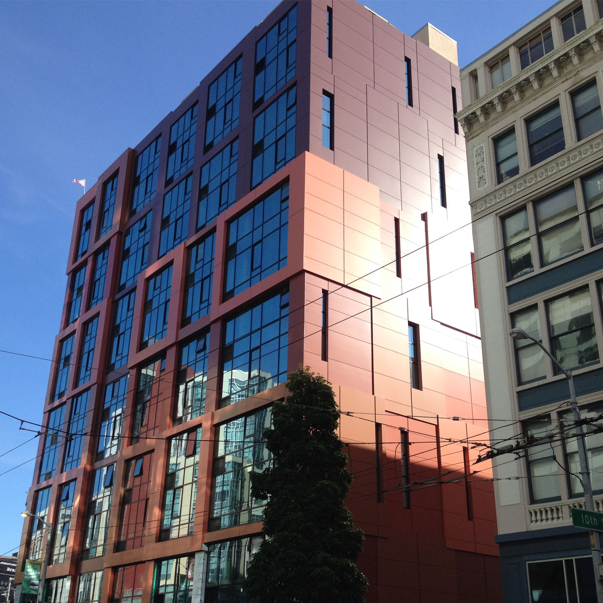 As part of a redevelopment project in Downtown San Francisco, this six-story building was reimagined with overlapping composite aluminum panels. Pacific Erectors installed 30,000 square feet of Alucobond paneling manufactured by Keith Panel Systems of Vancouver, British Columbia. The bold choice of colors and façade articulation were instrumental in making this project exceptional and unique.